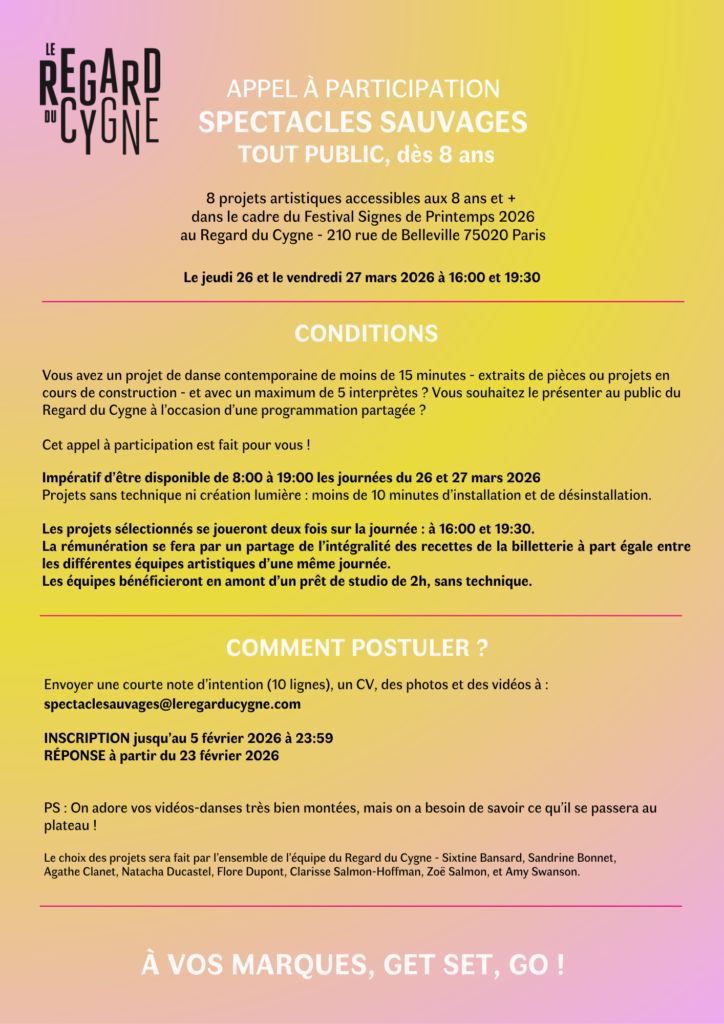 Les Spectacles Sauvages reviennent au Regard du Cygne pour notre festival Signes de Printemps. Expérimentation, rencontres, émerveillement : c’est une invitation à montrer vos recherches chorégraphiques sur notre plateau.